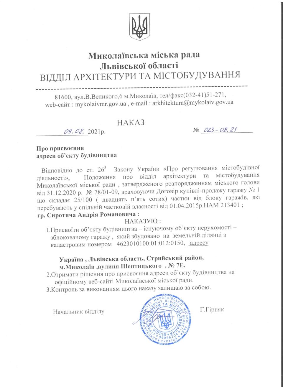 Про присвоєння адреси об’єкту будівництва м. Миколаїв, вул. Шептицького, 7Е Четвер, 12 Серпня 2021 Наказ Завантажити файл