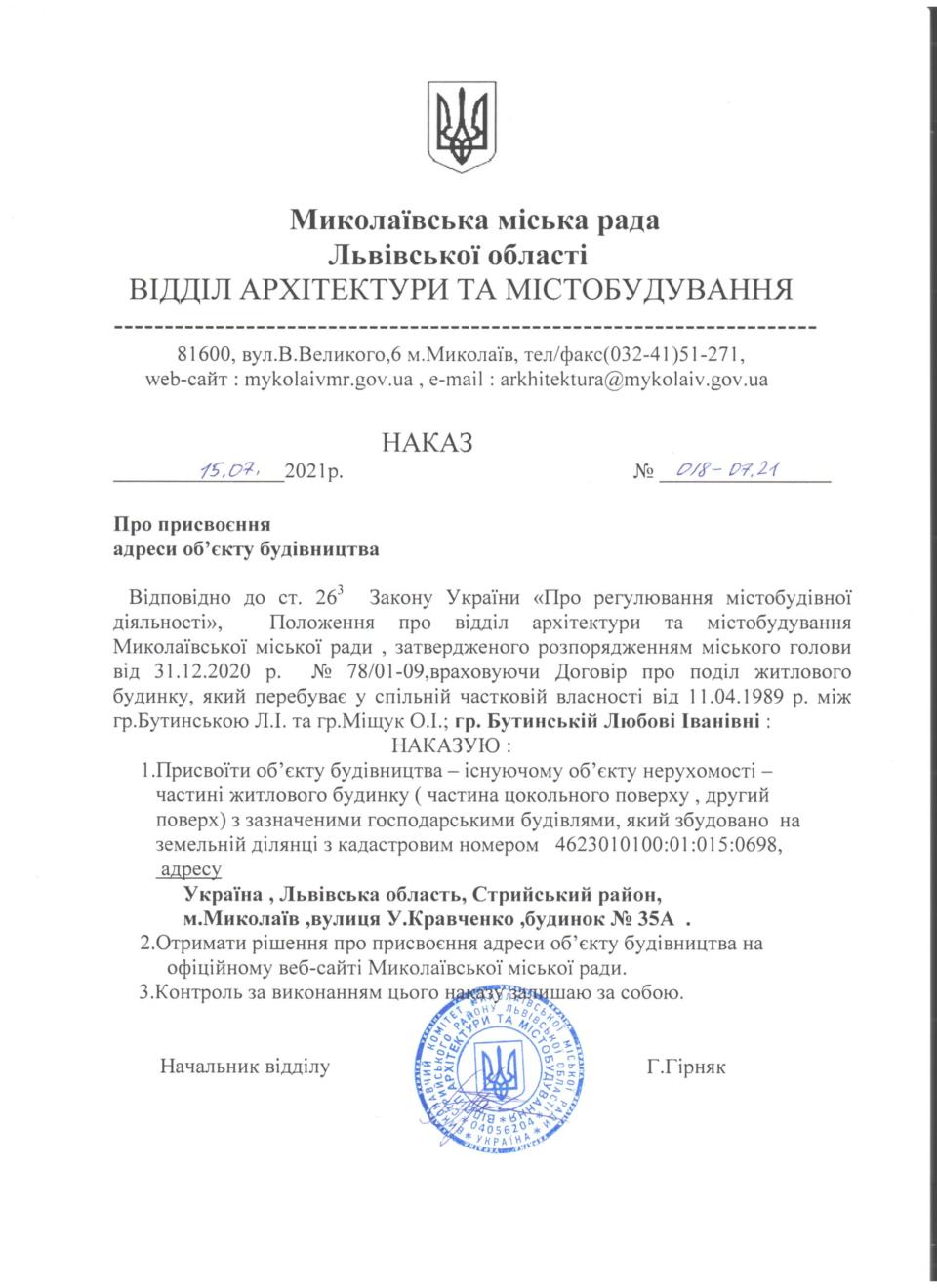 Про присвоєння адреси об’єкту будівництва м. Миколаїв, вул. У.Кравченко , буд. 35А Четвер, 15 Липня 2021 Наказ Завантажити файл