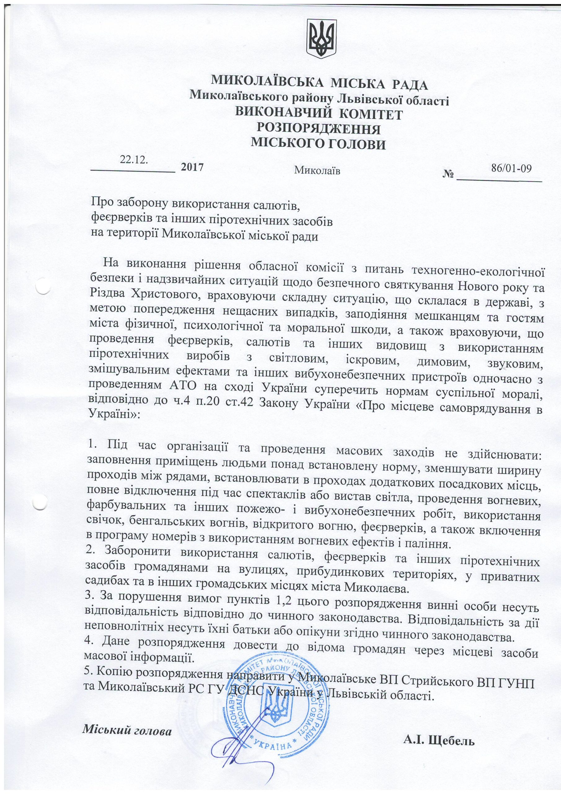 Про заборону використання салютів, феєрверків та інших піротехнічних засобів на території Миколаївської міської ради Вівторок, 26 Грудня 2017