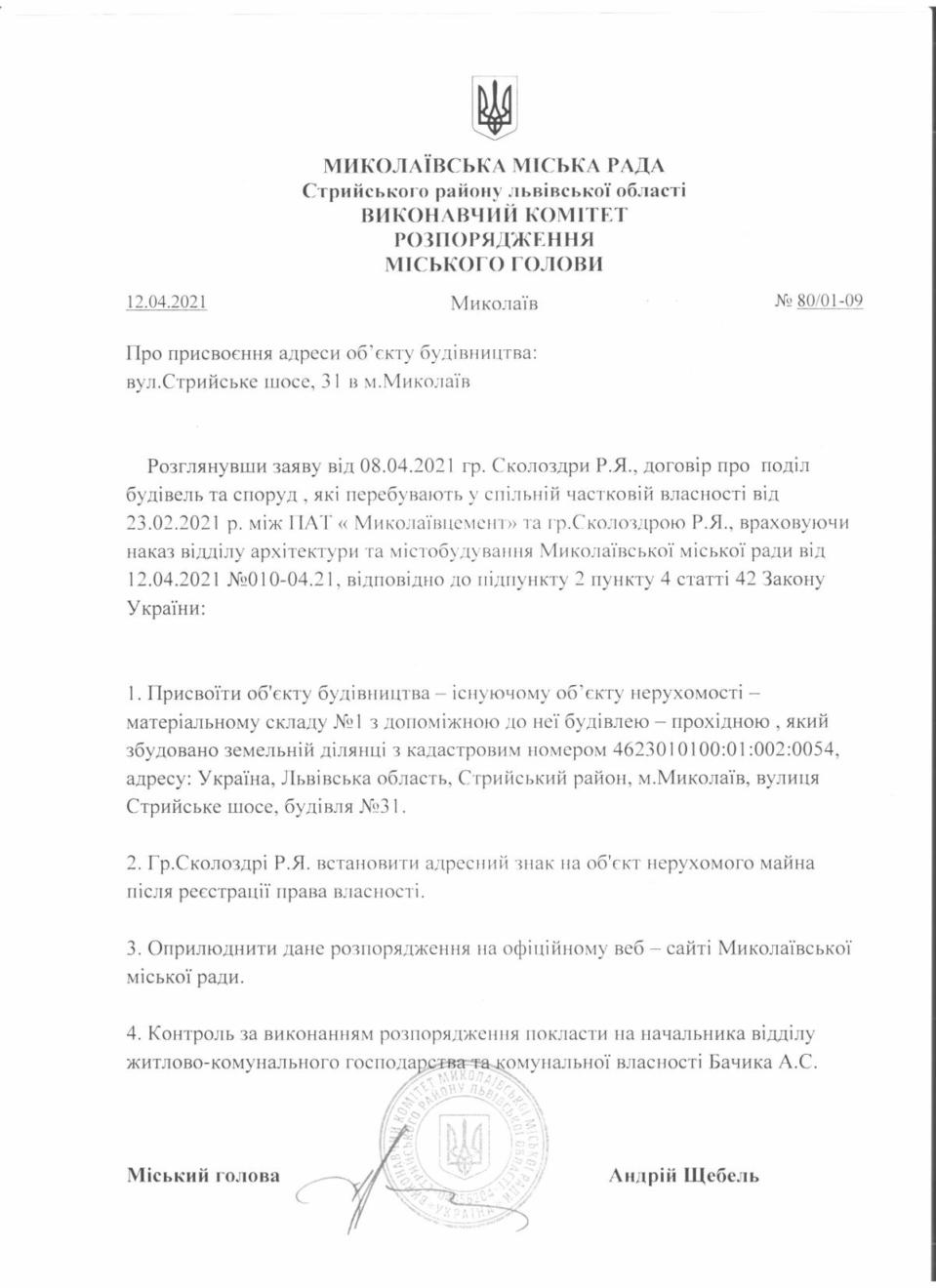 Розпорядження №80/01-49 “Про присвоєння адреси об’єкту будівництва: вул.Стрийське шосе, 31 в м.Миколаїв” Вівторок, 13 Квітня 2021 Розпорядження №80/01-49 Завантажити файл