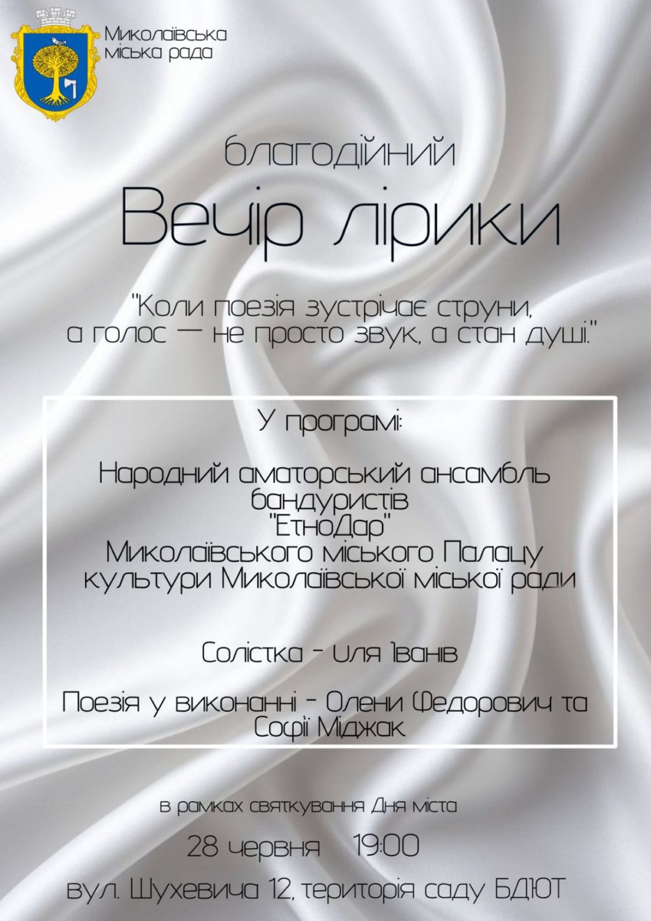 28 червня, о 19:00 год, у саду Миколаївського міського Будинку дитячої та юнацької творчості (вул. Шухевича, 12) відбудеться благодійний вечір лірики.