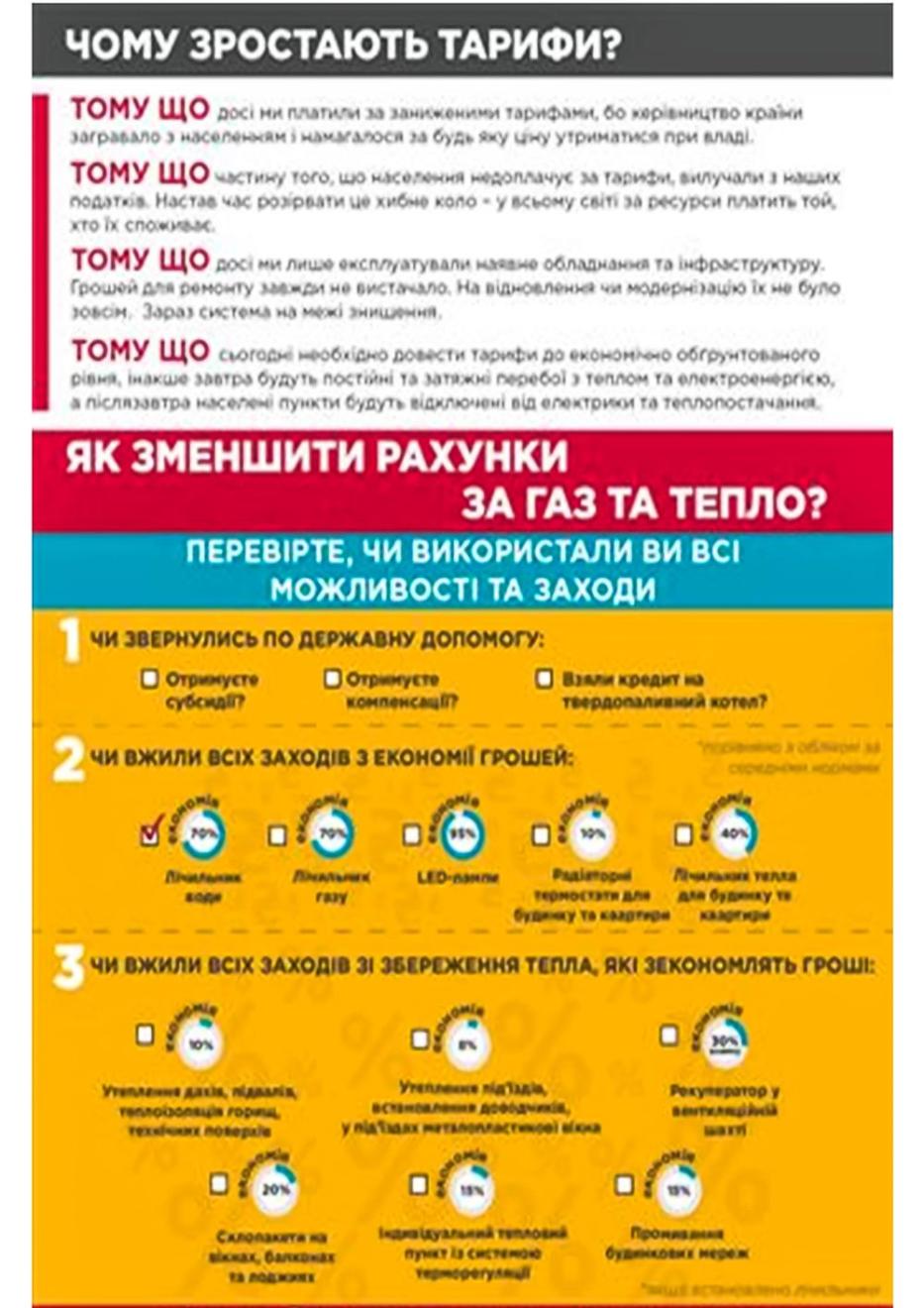 На виконання листа Мінрегіону від 26.03.2015 № 7/9-3266 та на виконання урядової ініціативи “Енергетична незалежність України” Міністерство регіонального розвитку, будівництва та житлово-комунального господарства України просить забезпечити отримання та розповсюдження в місцях масового скупчення громадян-споживачів житлово-комунальних послуг (адміністративні будівлі органів місцевої влади та їх структурних підрозділів, будівлі комунальних житлово-експлуатаційних організацій та інших комунальних підприємств) спеціально виготовлених інформаційно-роз’яснювальних матеріалів (плакат “Чому зростають тарифи” та брошура “Це дуже просто”).