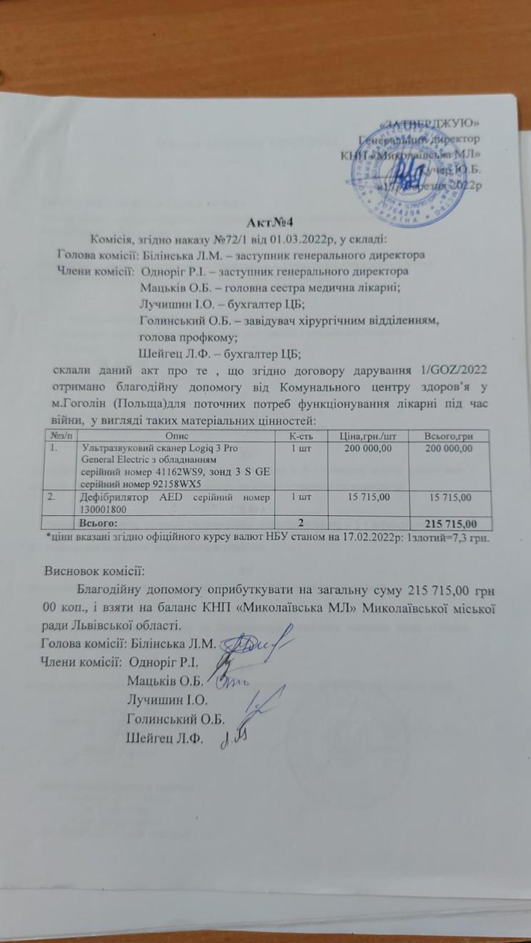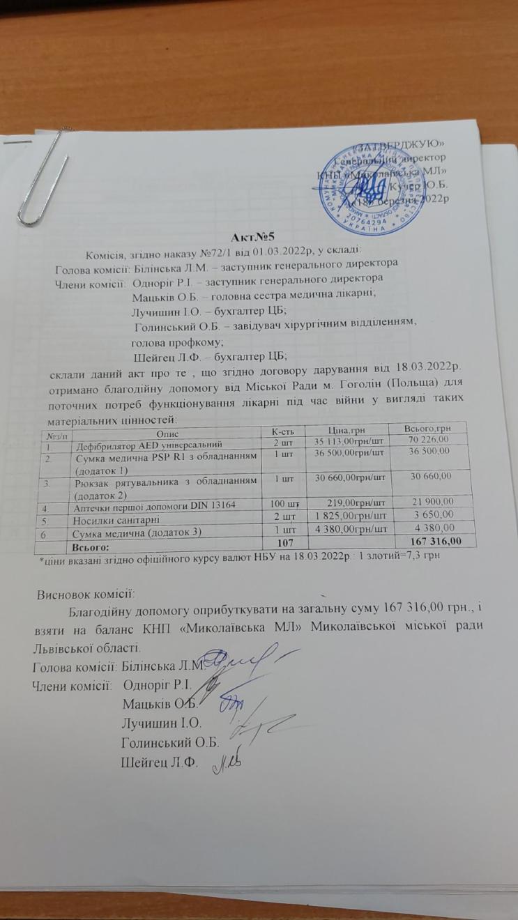 Вагому допомогу отримало КНП «Миколаївська міська лікарня» від громади м. Ґоґолін: ультразвуковий сканер, дефібрилятори, носилки, аптечки, рятувальні сумки та наплічники, різноманітний медичний інвентар, медикаменти, засоби гігієни…