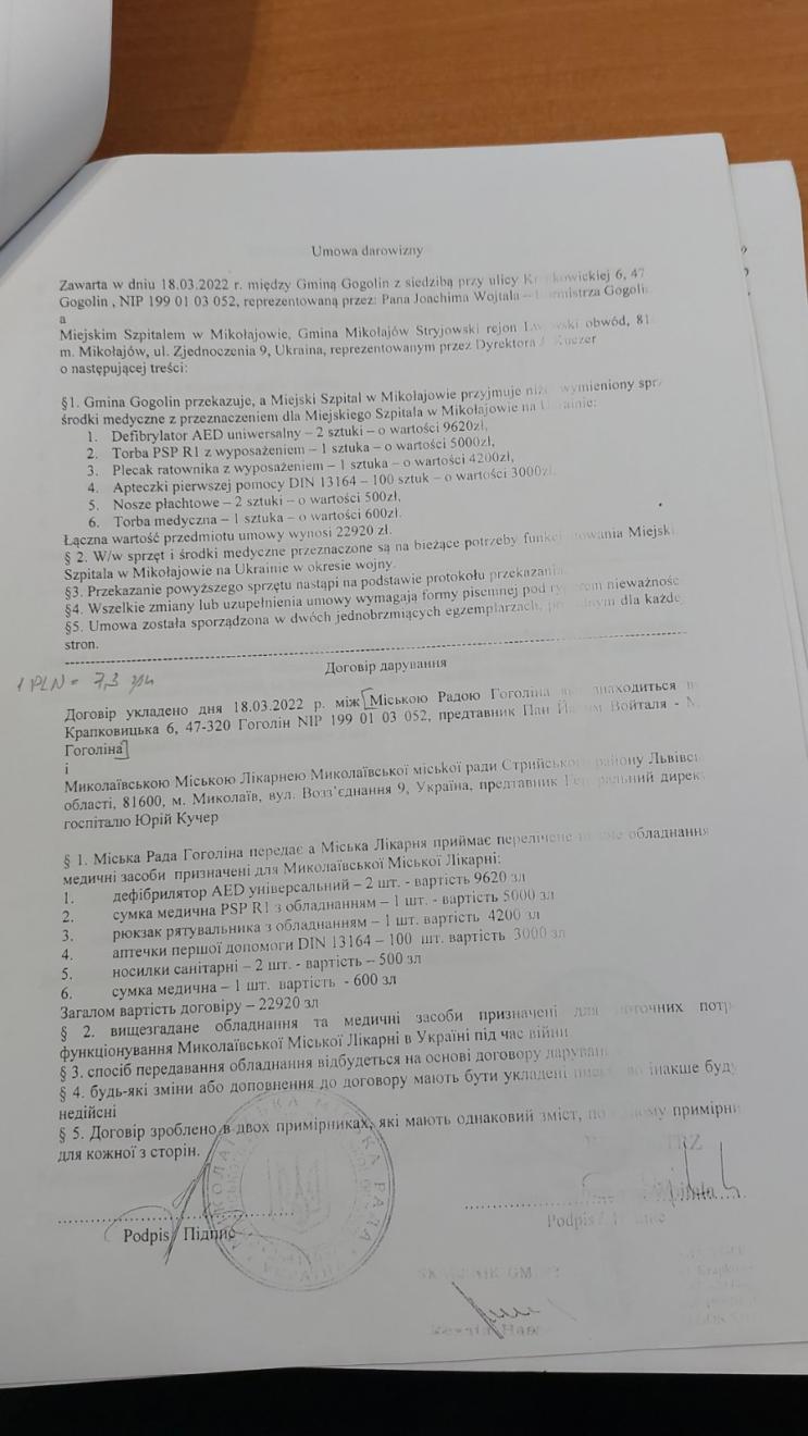 Щиро дякуємо громаді Ґоґолін за корисну допомогу. Завдяки Вам, ми змогли частково забезпечити Миколаївську міську лікарню необхідним медичним обладнанням та медикаментами, а також наших військових на передовій тактичними аптечками.